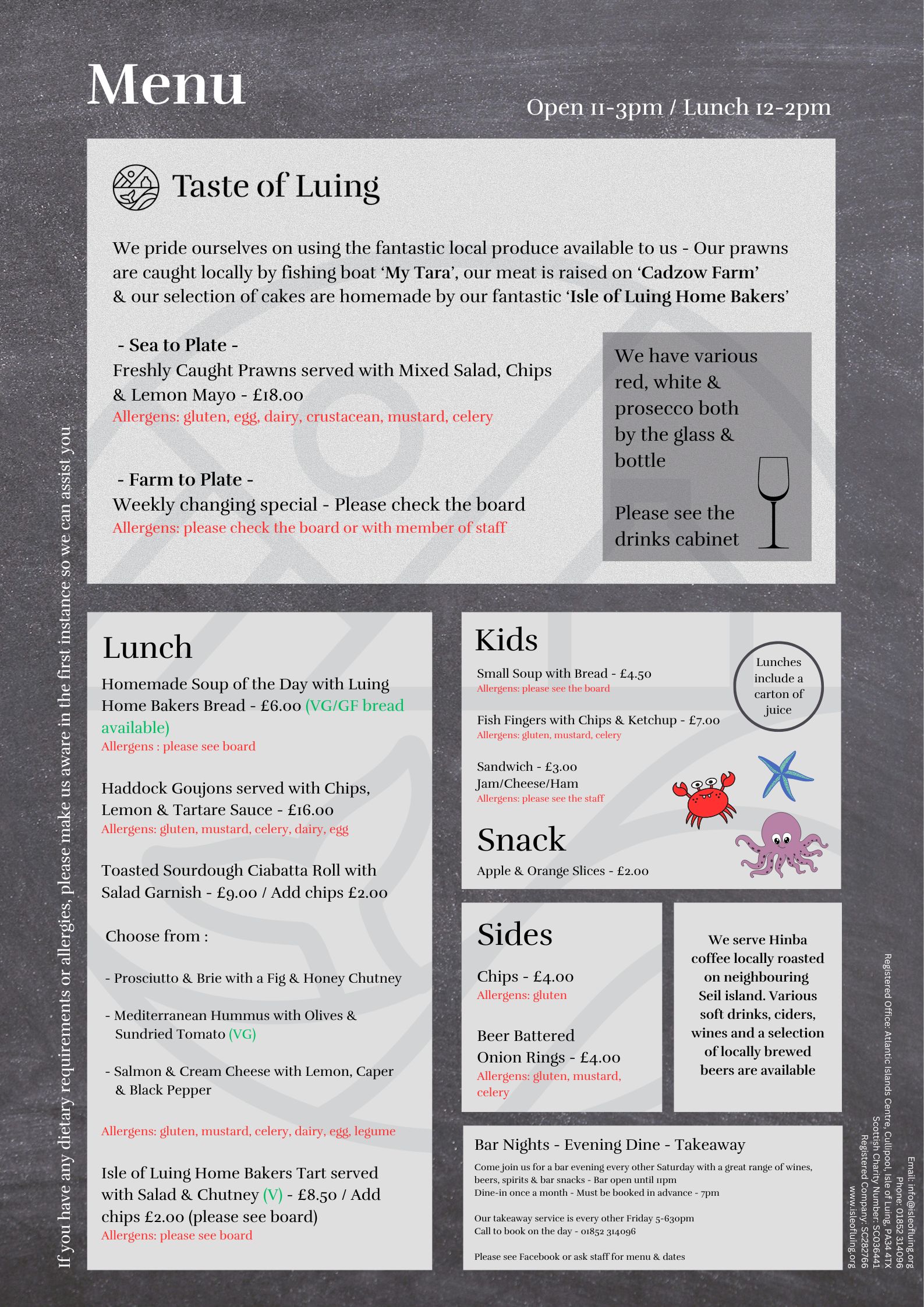 We also use local produce whenever possible such as Luing landed prawns, our bakers tart & cakes are baked on the island by our lovely volunteer bakers!